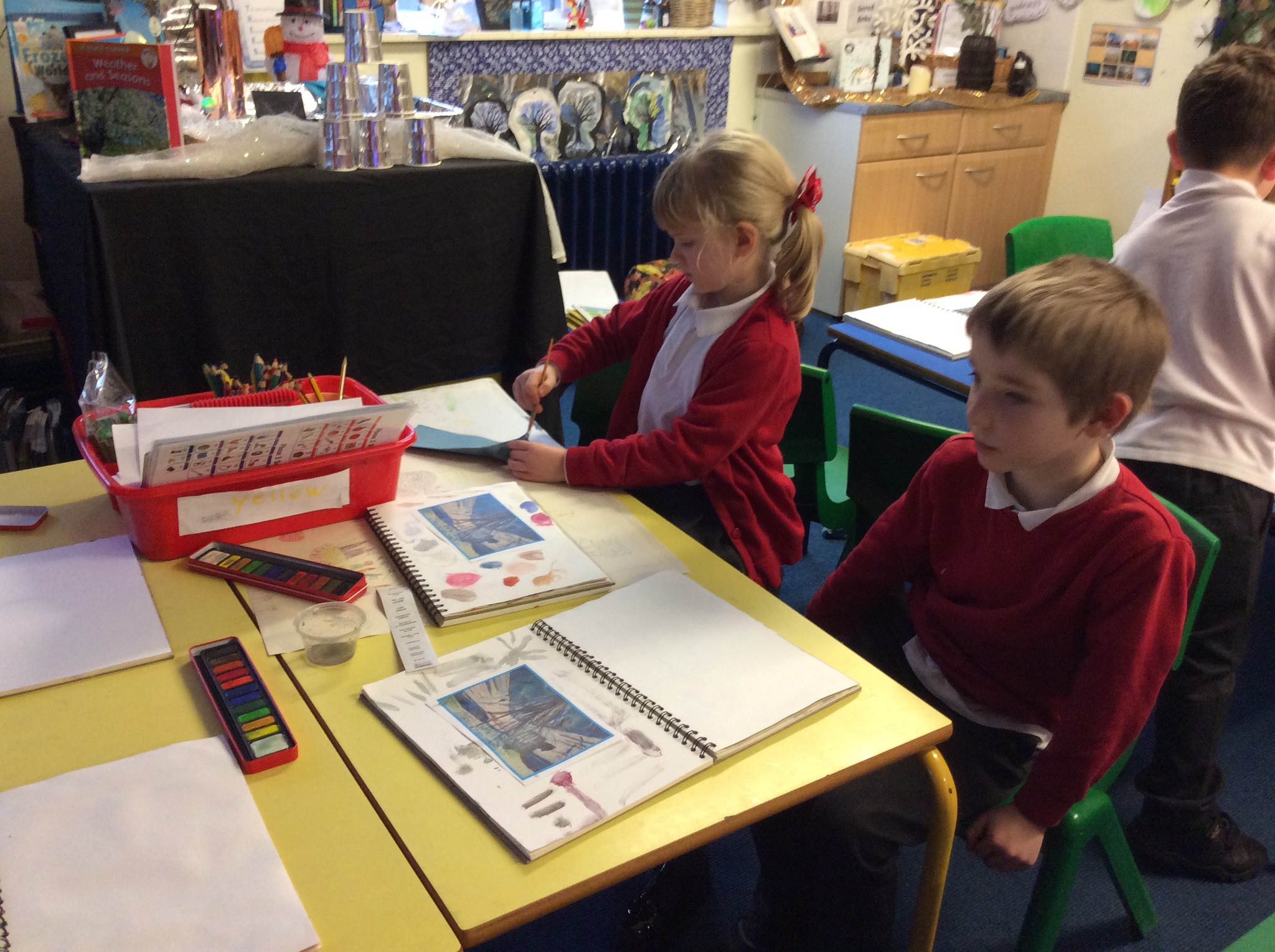 appearance of trees during wintertime. We noticed how the branches become bare and how they create intricate patterns against the winter sky. To bring these observations to life, the children used watercolours to paint their own winter trees. They experimented with different shades of blues, whites, and greys to depict the cool, crisp atmosphere of winter to create paintings like Monet.