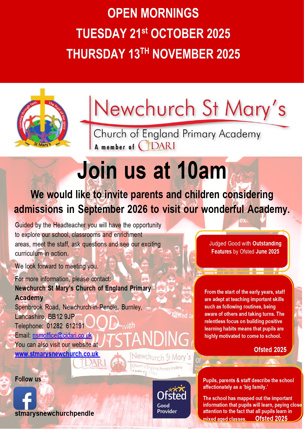 Open Mornings Tuesday 21st October & Thursday 13th November for September 2026 admissions